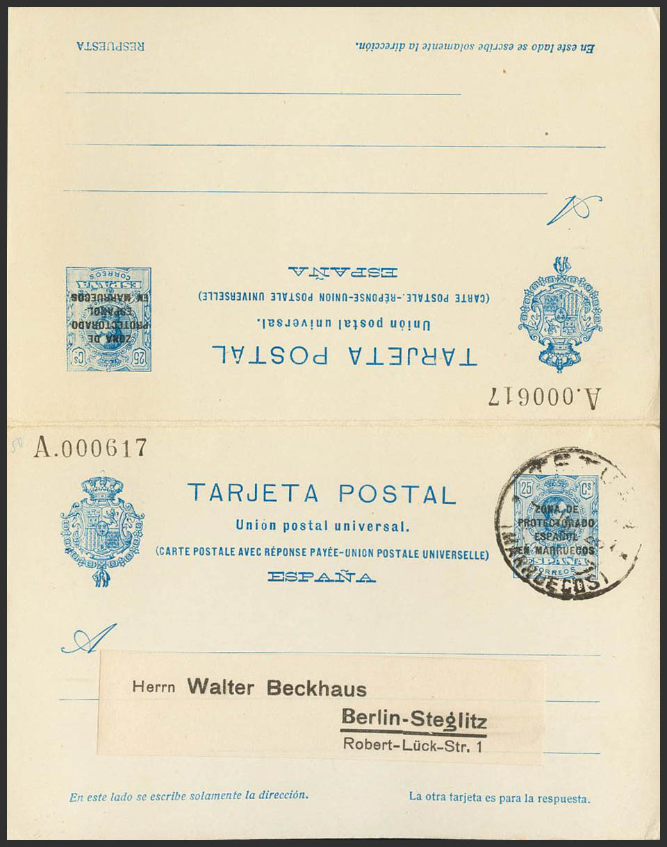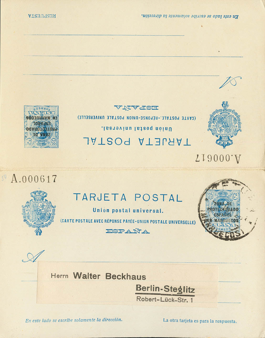 EP18. 1924. 25 cts+25 cts azul sobre Tarjeta Entero Postal, de ida y vuelta, la ida circulada de TETUAN a BERLIN (ALEMANIA). MAGNIFICA. Edifil 2019: +225 Euros