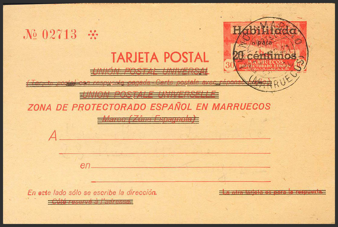 EP27i. 1941. 20 cts sobre 30 cts rojo sobre Tarjeta Entero Postal, de vuelta circulada de KETAMA a TANGER (el texto está escrito a lápiz y aunque se ha pretendido borrar, aún se puede leer). Matasello LLANO AMARILLO / (MARRUECOS), al dorso llegada. MAGNIFICA Y RARISIMA CIRCULADA, EL CATALOGO MENCIONA SU EXISTENCIA PERO NO SE ATREVE A DARLE VALOR, MUY POSIBLEMENTE PORQUE NO CONOZCA EL ENTERO DOBLE COMPLETO Y SOLO SE CONOZCA DIVIDIDO COMO ESTE EJEMPLAR, LAIZ EN SU EDICION ESPECIALIZADA MENCIONA LAS TARJETAS TAMBIEN SEPARADAMENTE, LE DA UN VALOR DE 700 EUROS A CADA UNA DE ELLAS.