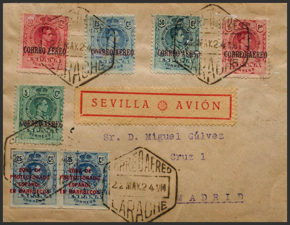 62s(2), 292/96. 1924. 25 cts azul SIN DENTAR, pareja y serie completa de Correo Aéreo de España. Correo Aéreo de LARACHE a MADRID. Al dorso llegada. MAGNIFICA Y RARA COMBINACION DE FRANQUEO.
