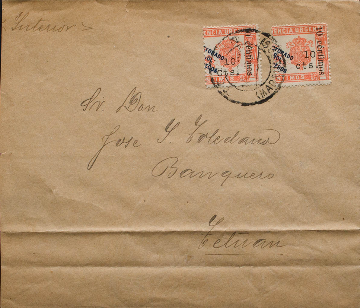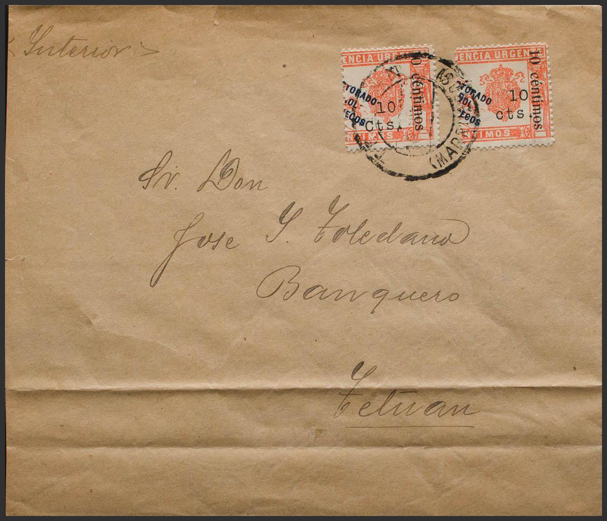 67(2). 1920. Dos medios sellos de 10 cts sobre 20 cts rosa. Correo Interior de TETUAN. MAGNIFICA Y RARA.