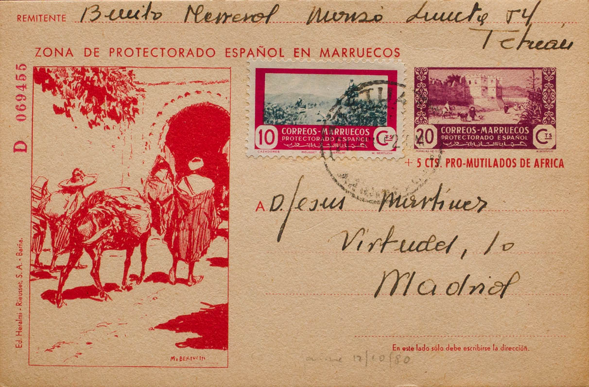 EP89, 331. 1952. 20 cts lila y rojo (Serie D, Tipo III) sobre Tarjeta Entero Postal de TETUAN a MADRID, con franqueo complementario de 10 cts. MAGNIFICA Y RARA. (Láiz 2006, 310 Euros)