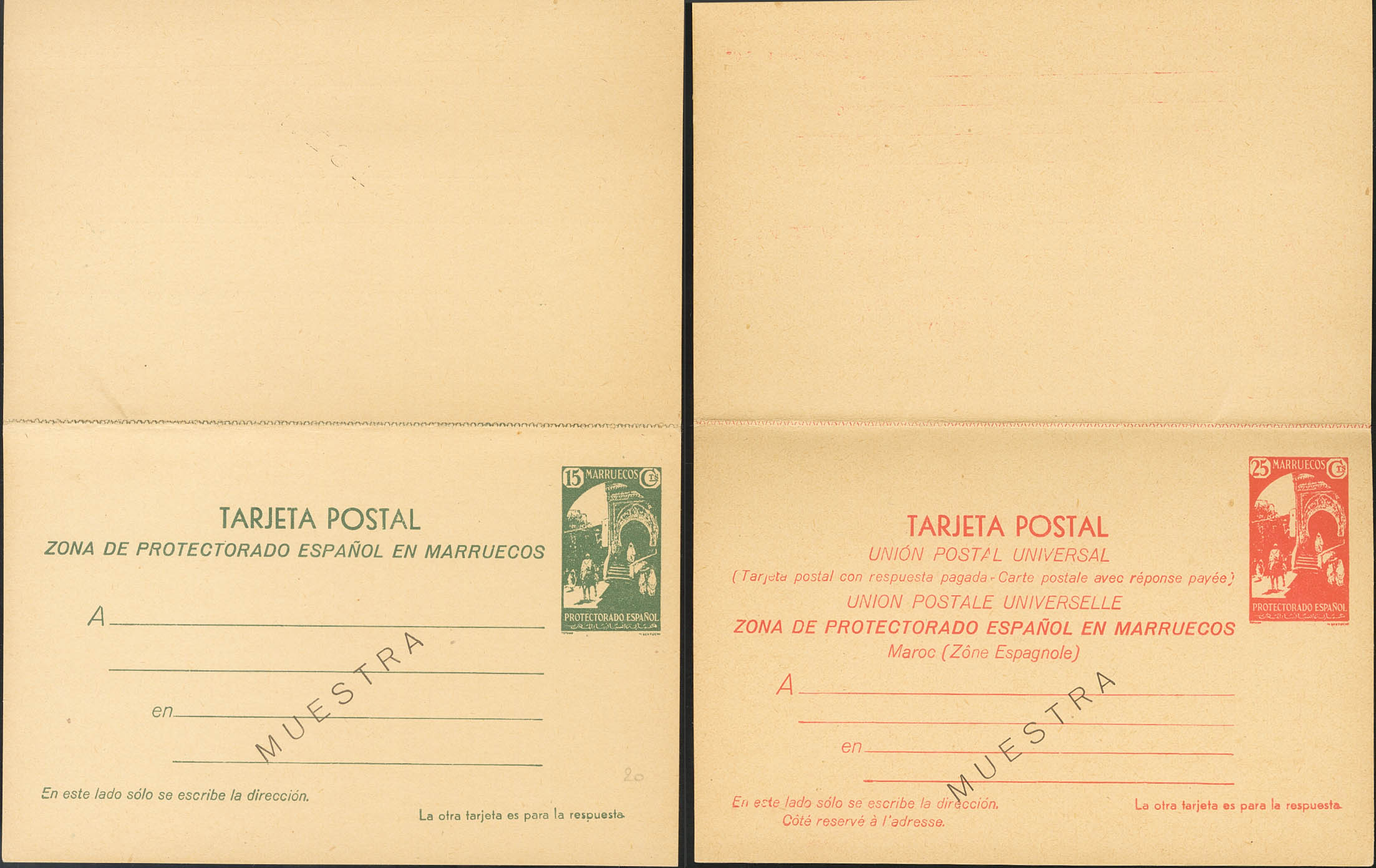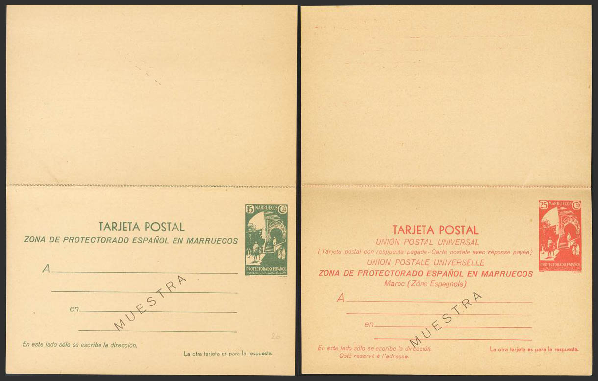(★) EP22/23M. 1933. 15 cts+15 cts verde y 25 cts+25 cts rojo sobre Tarjetas Entero Postales, de ida y vuelta. MUESTRA. MAGNIFICAS. Edifil 2018: 290 Euros