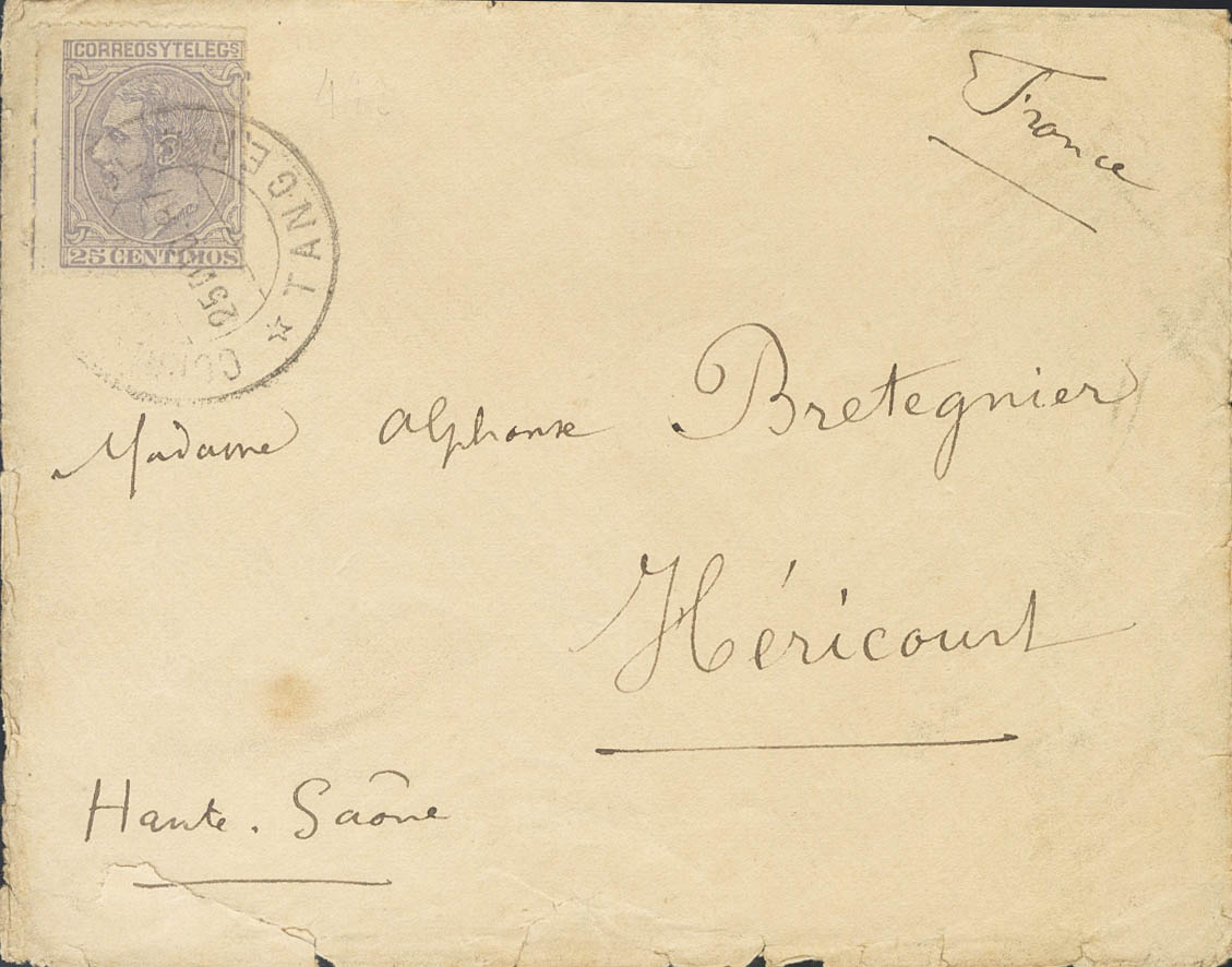 204. 1888. 25 cts gris. TANGER a HERICOURT (FRANCIA). Matasello CORREO ESPAÑOL / TANGER. MAGNIFICA Y RARA.