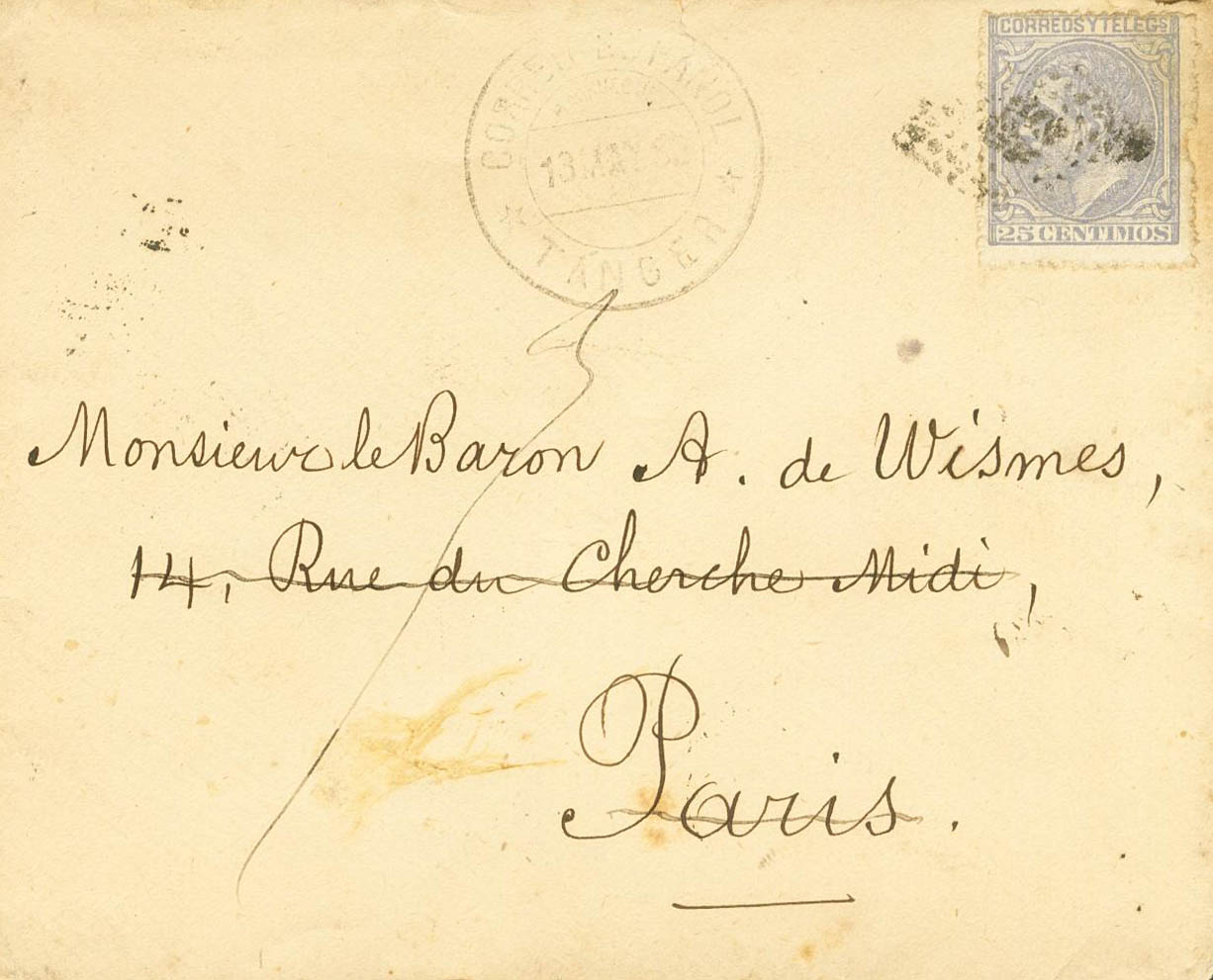 204. 1882. 25 cts lila gris. TANGER a PARIS (FRANCIA), reexpedida a NANTES. En el frente fechador CORREO ESPAÑOL / TANGER. MAGNIFICA.