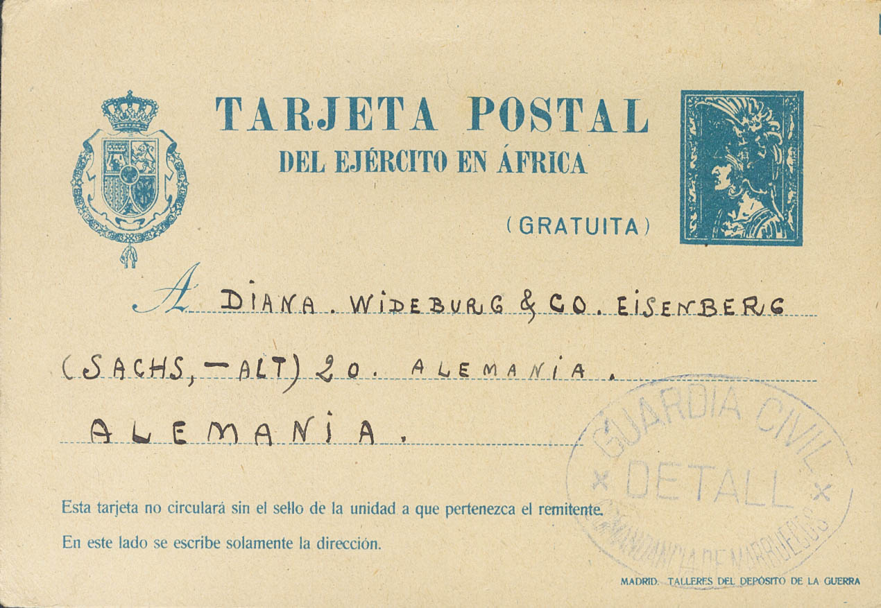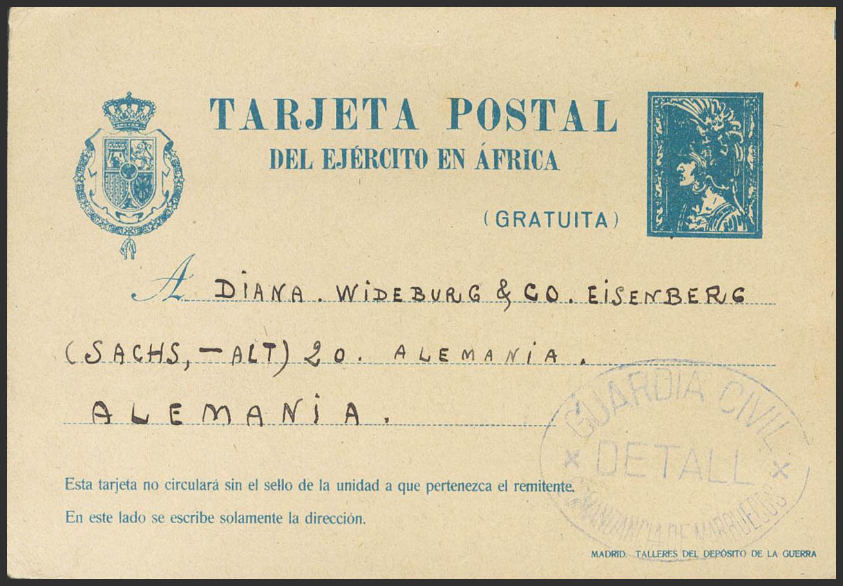 EP2A. 1923. Sin valor, azul sobre Tarjeta Entero Postal del Ejército de Africa de TETUAN a ALEMANIA. En el frente marca GUARDIA CIVIL / DETALL / COMANDANCIA DE MARRUECOS, en azul. MAGNIFICA.