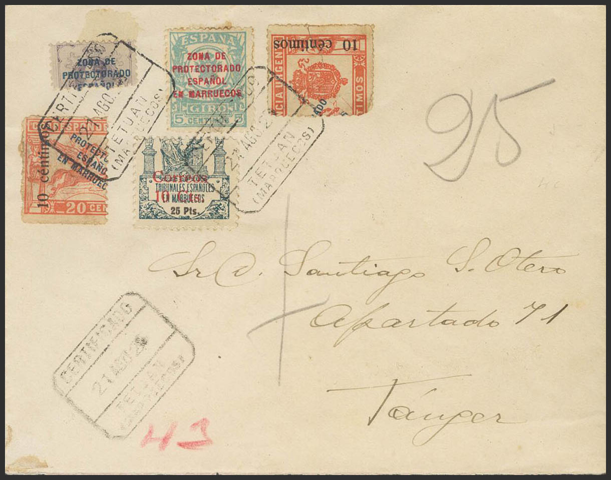 66(2), 70. 1920. 10 cts sobre 20 cts rojo, dos medios sellos y diversos valores. Certificado de TETUAN a TANGER. Al dorso llegada. MAGNIFICA.
