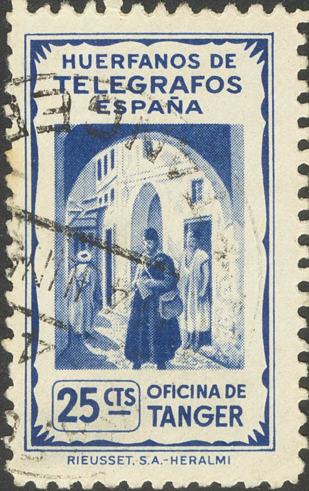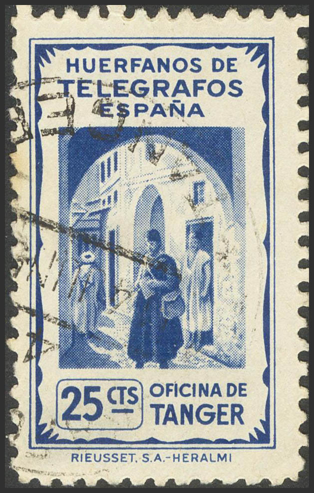 (1950ca). 10 cts lila, 10 cts rosa, dos sellos, 10 cts azul, 10 cts castaño y 25 cts azul. HUERFANOS DE TELEGRAFOS OFICINA DE TANGER. MAGNIFICOS.