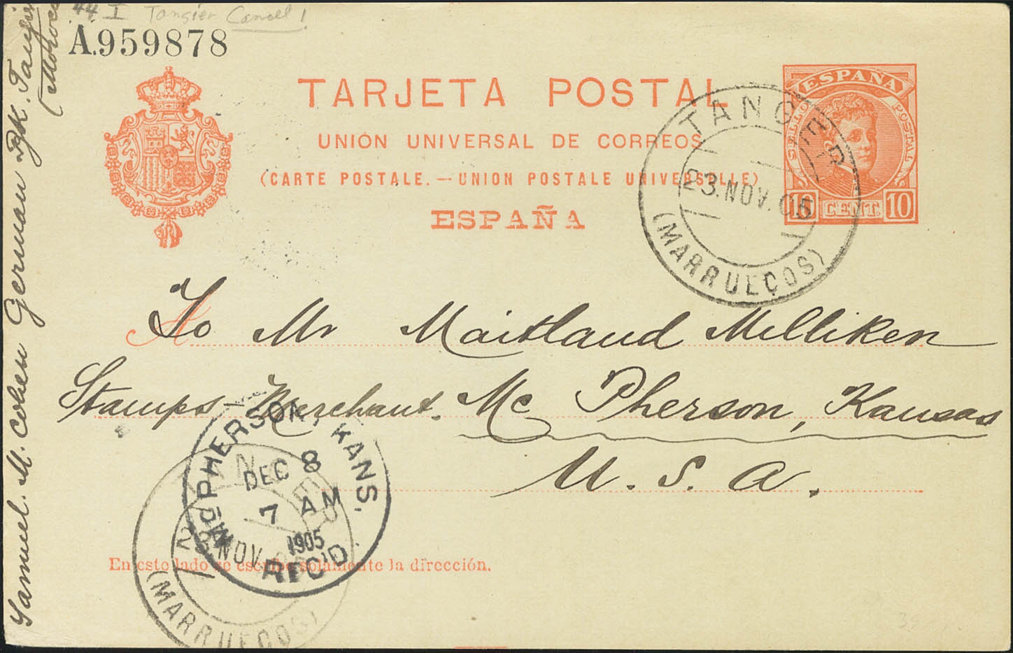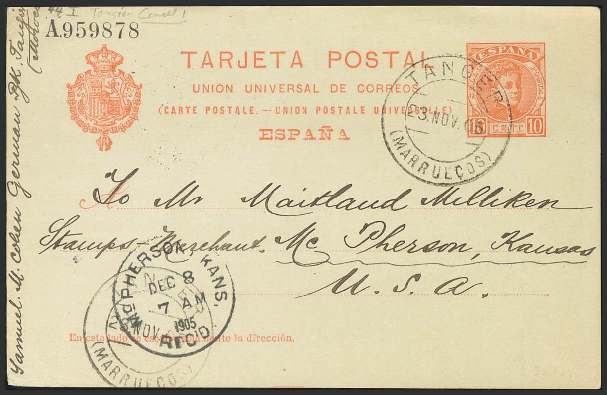 EP47A. 1905. 10 cts naranja sobre Tarjeta Entero Postal de España de TANGER a MCPHERSON (USA). En el frente llegada. MAGNIFICO Y RARISIMO DESTINO CON ORIGEN EN MARRUECOS, NO RESEÑADO EN LA OBRA DE LAIZ CON ESTE DESTINO.