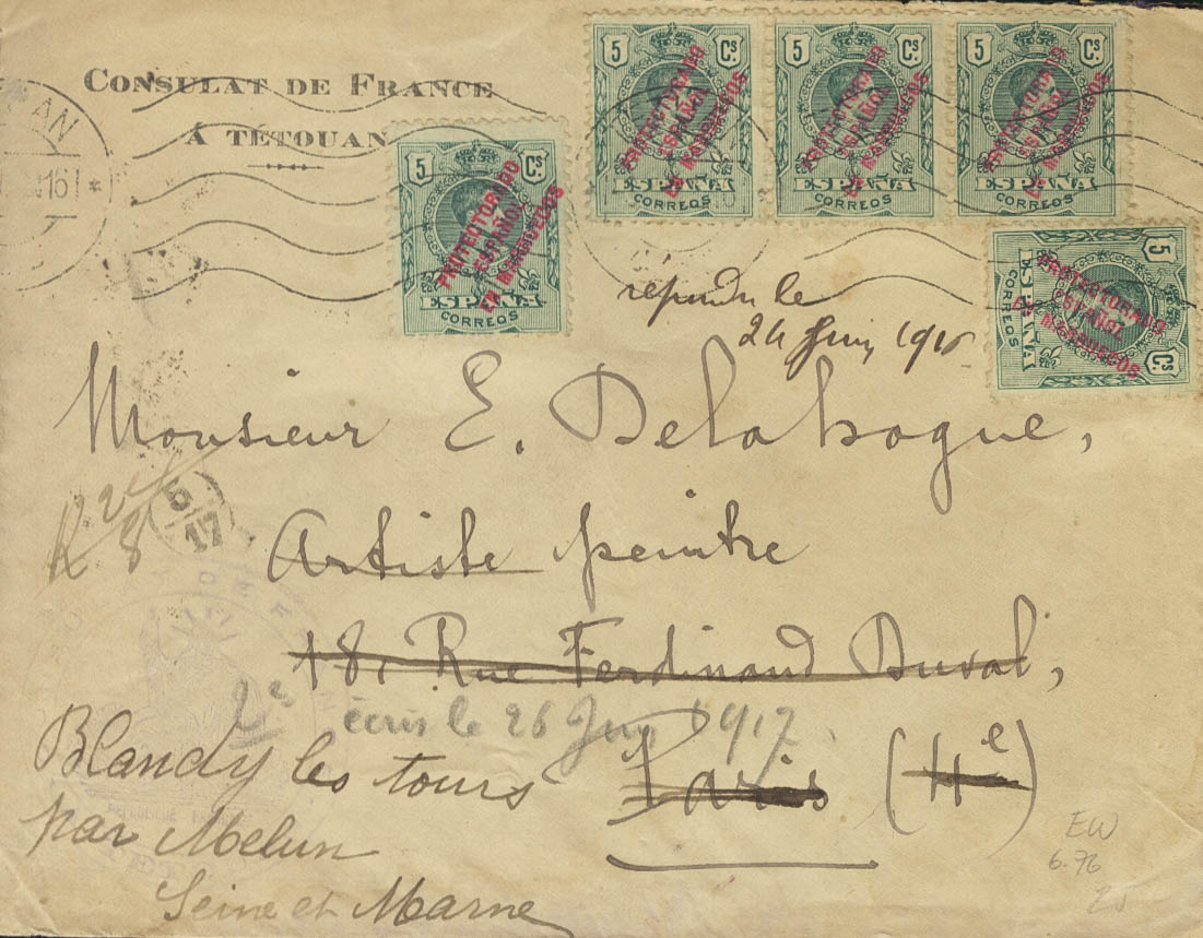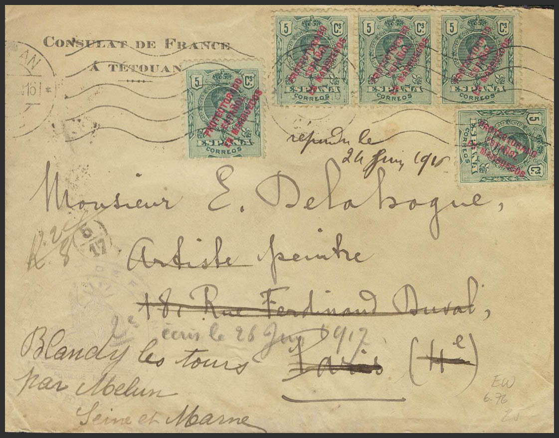 45(5). 1916. 5 cts verde, cinco sellos. TETUAN a PARIS (FRANCIA), reexpedida a BLANDY LES TOURS y remitida desde el Consulado Francés. Al dorso llegada. MAGNIFICA.