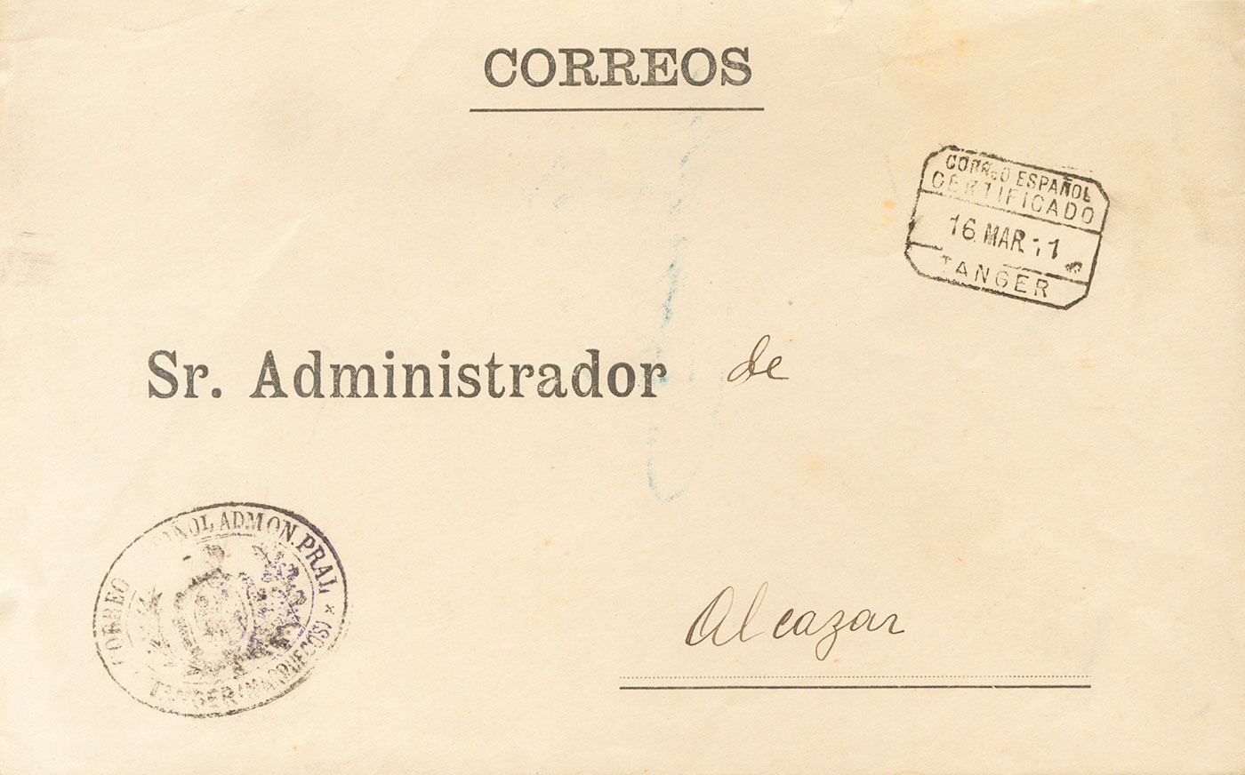 1911. Certificado de TANGER a ALCAZAR. Marca de franquicia CORREO ESPAÑOL ADMON PRAL / TANGER (MARRUECOS). MAGNIFICA Y RARA.