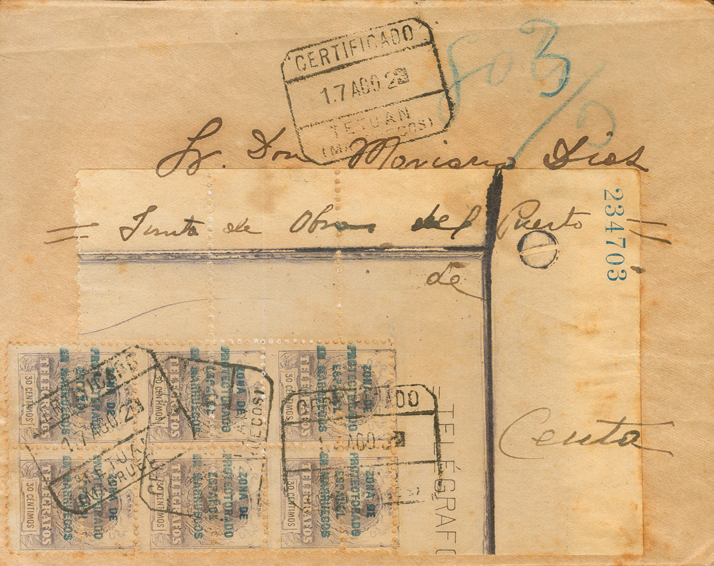 12(6). 1920. 30 cts violeta, bloque de seis, esquina de pliego. Certificado de TETUAN a CEUTA. Al dorso llegada. MAGNIFICA Y RARISIMO FRANQUEO, MUY ESPECTACULAR.
