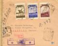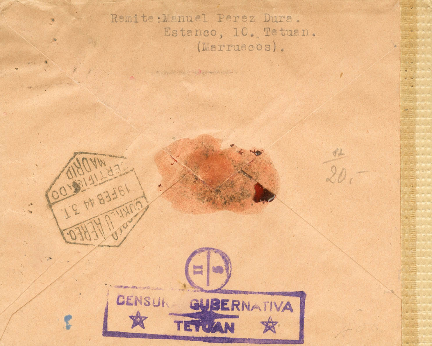 1944. 1 pts castaño, 1´50 pts violeta y 2 pts violeta castaño. Certificado de TETUAN a NYKOPING (SUECIA). En el frente marca CENSURA GUBERNATIVA / TETUAN y marcas de censura alemanas. MAGNIFICA E INUSUAL DESTINO.