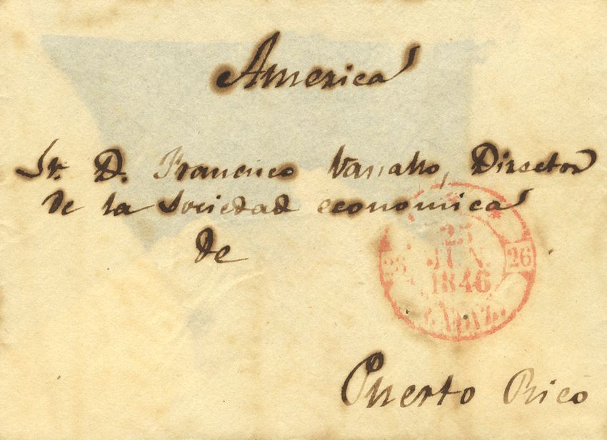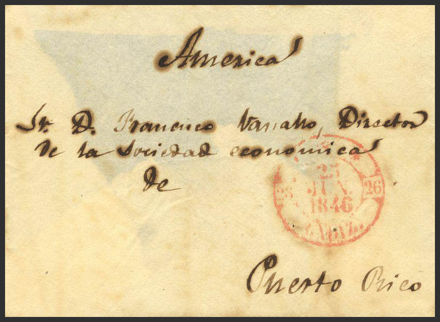 1846. CADIZ a SAN JUAN DE PUERTO-RICO. Marca baeza *** / CADIZ. MAGNIFICO Y RARISIMO DESTINO EN LA EPOCA PREFILATELICA. Ex-Gaspar Roca.