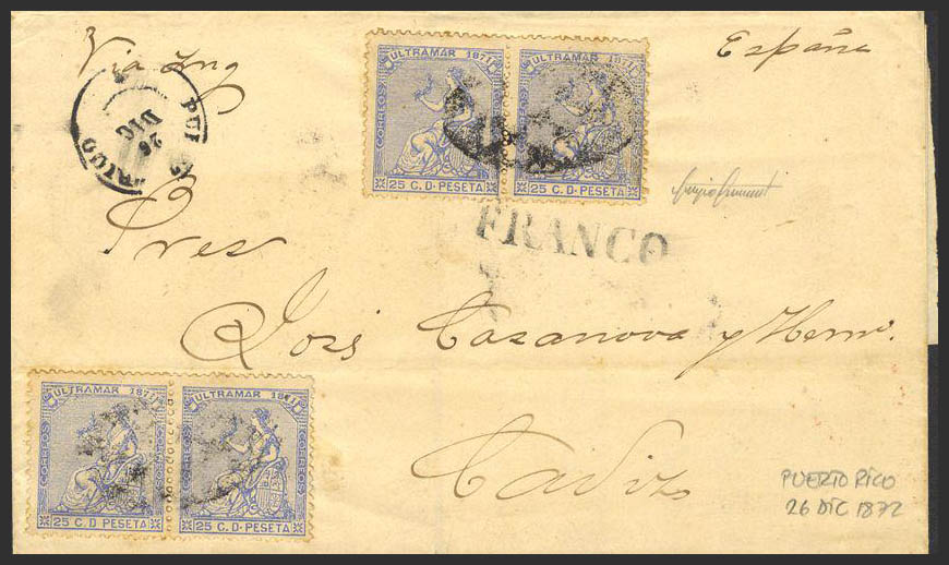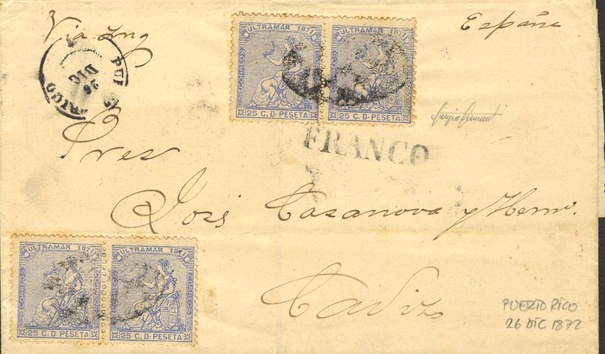 Ant. 22(4). 1872. 25 cts azul, dos parejas. SAN JUAN DE PUERTO-RICO a CADIZ. En el frente marca FRANCO. MAGNIFICA Y RARA. Cert. SISMONDO. Ex-Gaspar Roca.