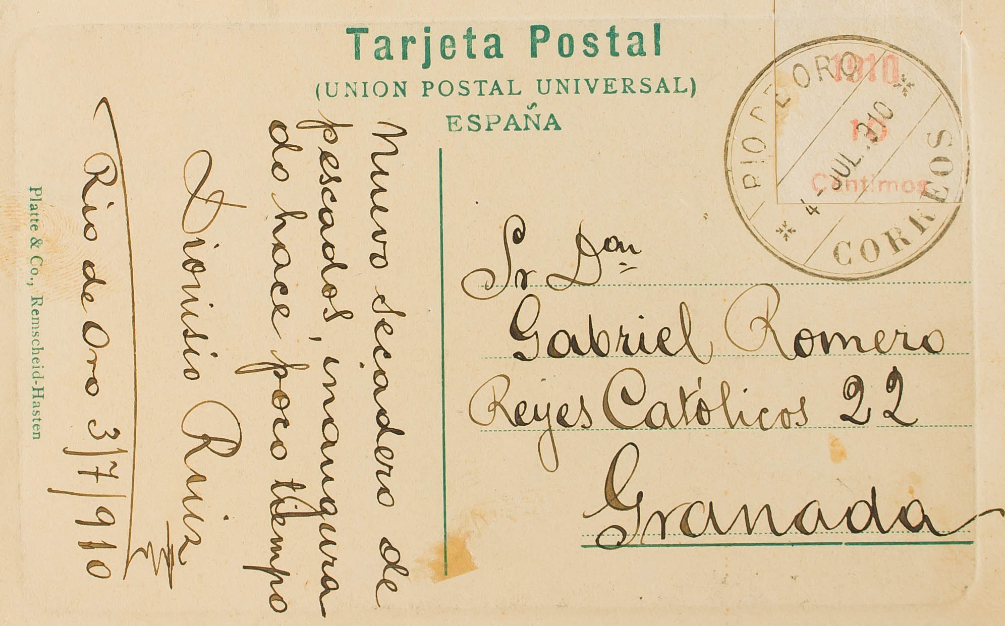 55MP. 1910. 10 cts rojo sobre borde de hoja. Tarjeta Postal de RIO DE ORO a GRANADA. Matasello RIO DE ORO / CORREOS, al dorso llegada. MAGNIFICA.