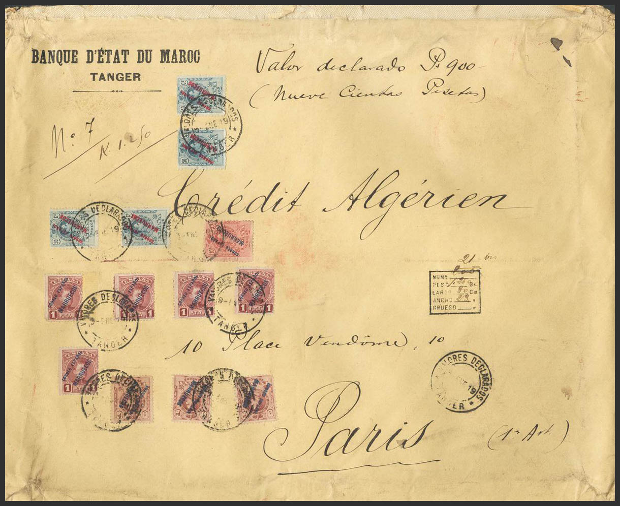 3, 8(4), 9(3), Marruecos 11. 1919. 10 cts rojo, 50 cts verde azulado, cuatro sellos, 1 pts carmín, tres sellos y 1 pts carmín de Maruecos, cinco sellos. Valores Declarados de TANGER a PARIS (FRANCIA). Matasello VALORES DECLARADOS / TANGER y al dorso tránsito. MAGNIFICO, RARO Y ESPECTACULAR FRANQUEO.