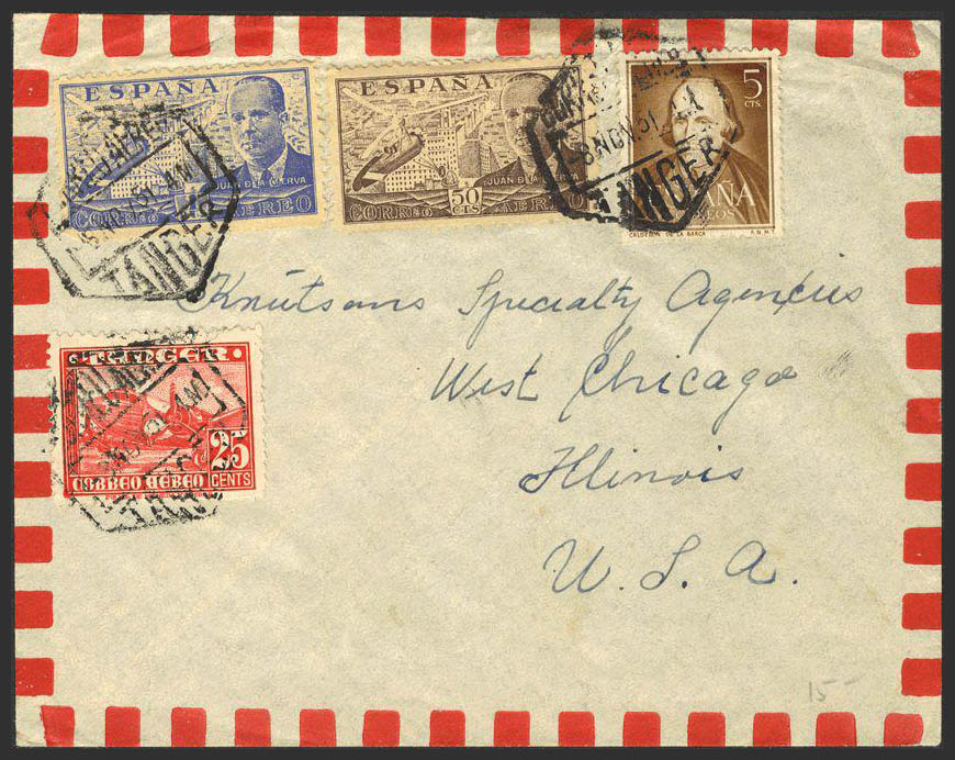 1015(2), Tanger 170, 171. 1951. 25 pts castaño pareja, 2 pts y 10 pts de Tánger. Certificado aéreo de TANGER a LOS ANGELES (USA). Al dorso llegada. MAGNIFICA Y UNICA CARTA CONOCIDA CON EL USO DE LOS SELLOS DE FALLA EN TANGER, POSIBLEMENTE LA CARTA MAS IMPORTANTE DE ESTE PERIODO EN EL QUE ERA HABITUAL EL USO DE LOS SELLOS DE ESPAÑA EN TANGER.
