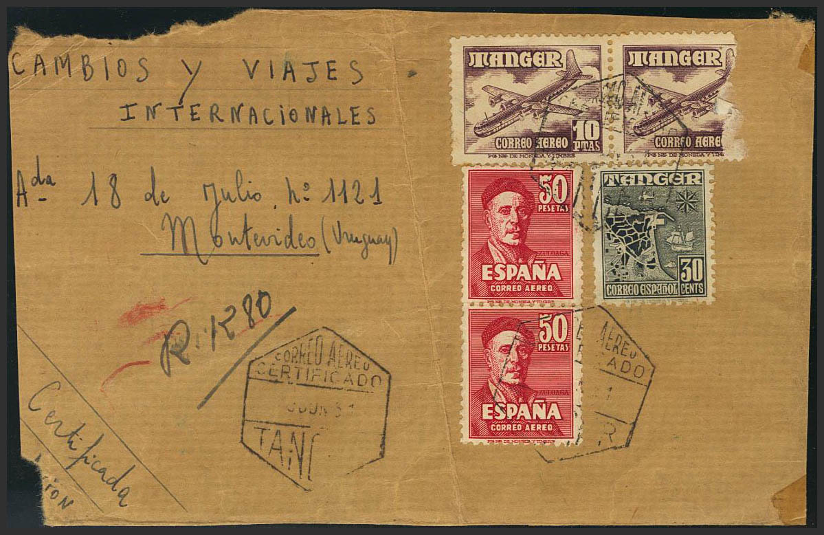 1016(2). 1951. 50 pts rojo, dos sellos y 30 cts y 10 pts (ligera erosión), sellos de Tánger. Frente de Certificado de TANGER a MONTEVIDEO (URUGUAY). ESPECTACULAR Y RARISIMO FRANQUEO, MAS AUN CON ORIGEN EN TANGER.