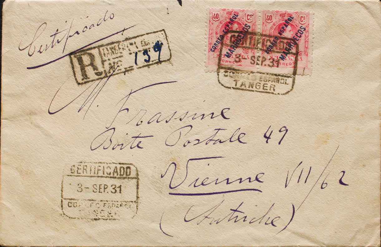7(2). 1931. 40 cts rosa, pareja. Certificado de TANGER a VIENA (AUSTRIA). Al dorso llegada. MAGNIFICA E INUSUAL ORIGEN Y DESTINO.