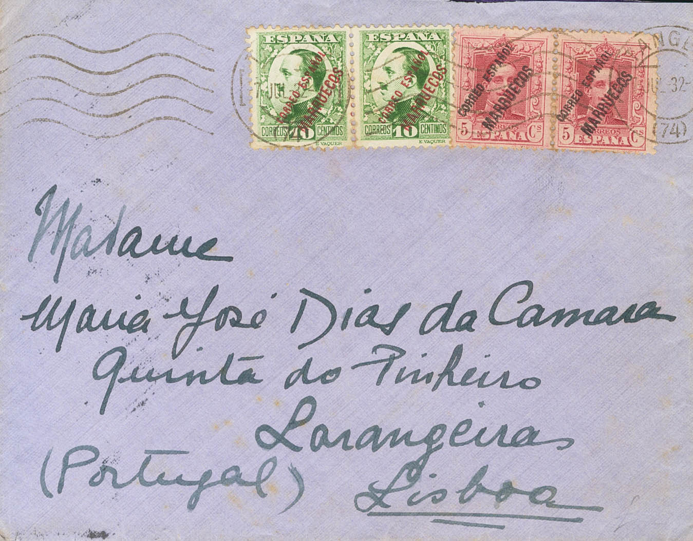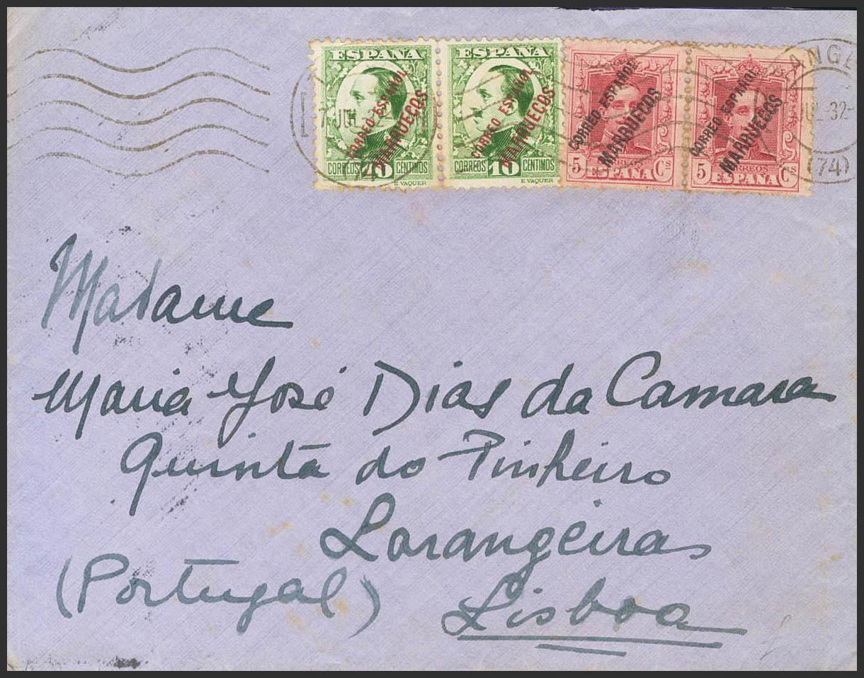 64(2), 19(2). 1932. 10 cts verde, dos sellos y 5 cts rosa, dos sellos. TANGER a LARANJEIRA (PORTUGAL). Al dorso tránsito. MAGNIFICA Y RARA.