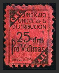 1937. 25 cts negro sobre rojo. CNT-AIT SINDICATO UNICO DE LA DISTRIBUCION / PRO VICTIMAS. MAGNIFICO Y RARO, NO CATALOGADO EN GUILLAMON.