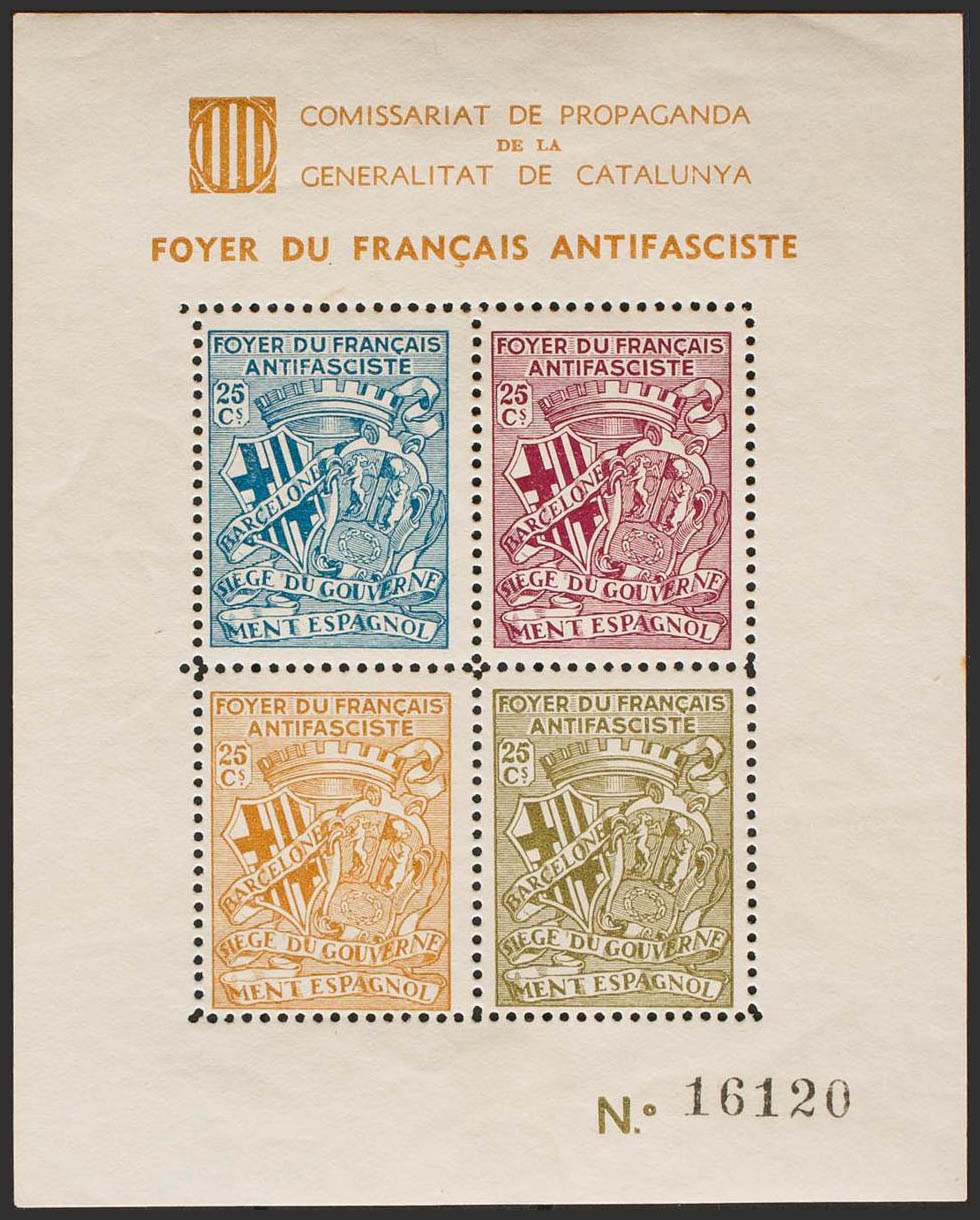 ★1937. Hoja bloque. FOYER DU FRANCAIS ANTIFASCISTE. BARCELONE. MAGNIFICA Y RARA. (Guillamón 2259)