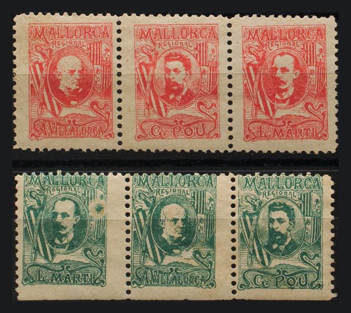 (★)(1901ca). Dos tiras de tres, en rosa y verde con motivos diferentes. BALEARES. MALLORCA REGIONAL. BONITAS Y RARAS. (Nathan B-4)