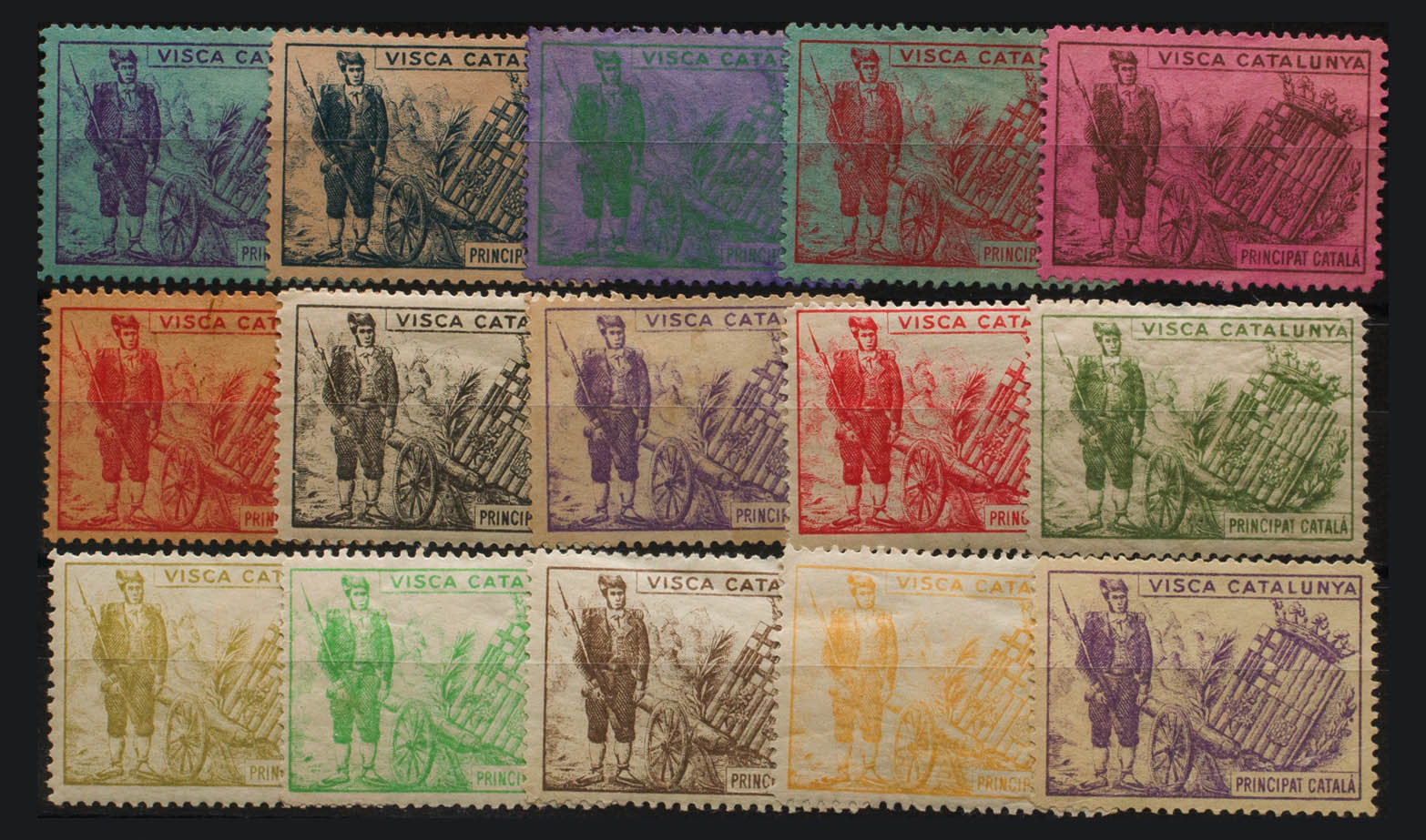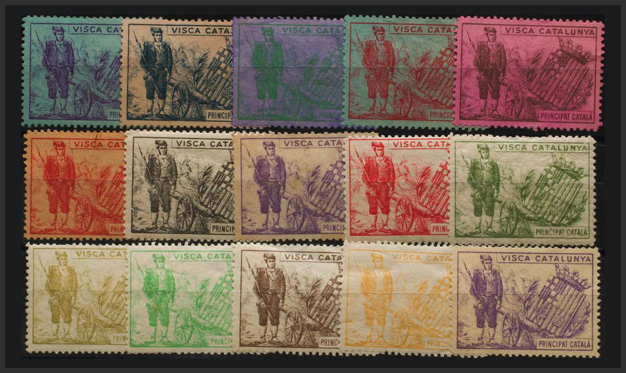 ★/(★)(1900ca). Precioso conjunto de quince viñetas en diferentes colores y papeles. CATALUÑA. PRINCIPAT CATALA. MAGNIFICAS Y RARAS. (Nathan 21)