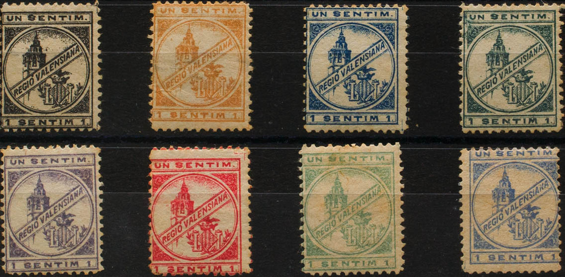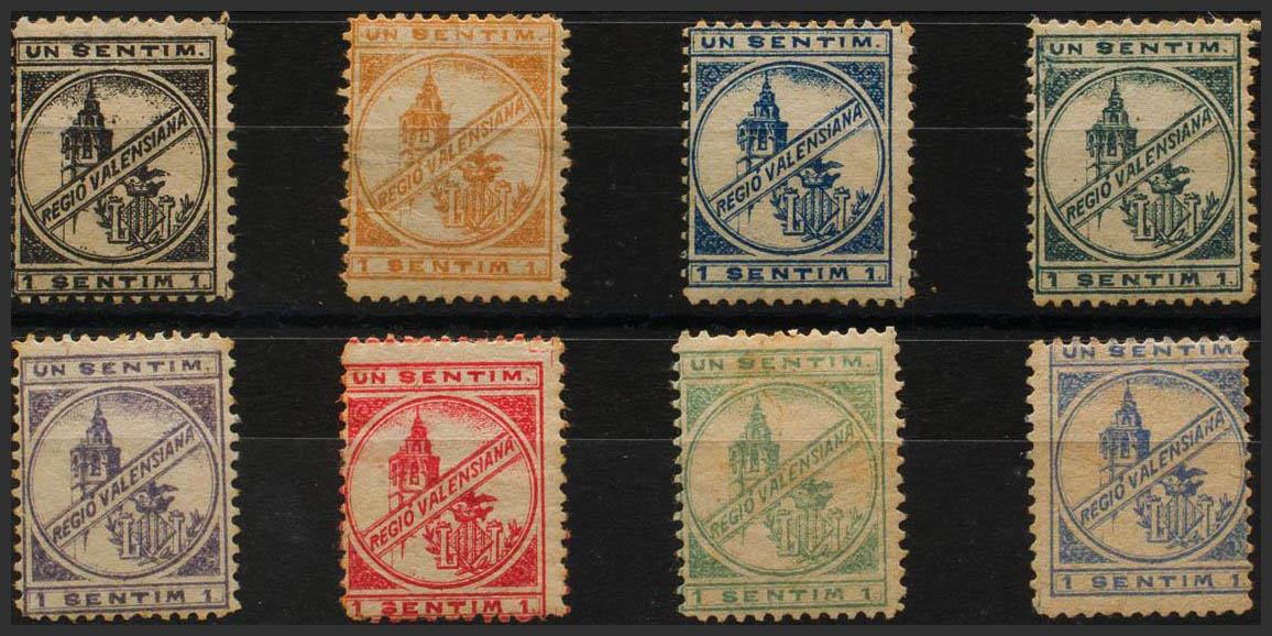 ★/(★)(1899ca). Ocho viñetas del 1 cts en diferentes colores. REGIO VALENSIANA. BONITAS Y RARAS. (Nathan V9)
