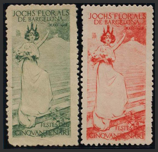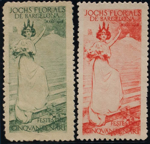 (★)1908. Dos viñetas en verde y rosa. CATALUÑA JOCHS FLORALS DE BARCELONA. MAGNIFICAS. (Nathan 58)