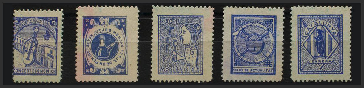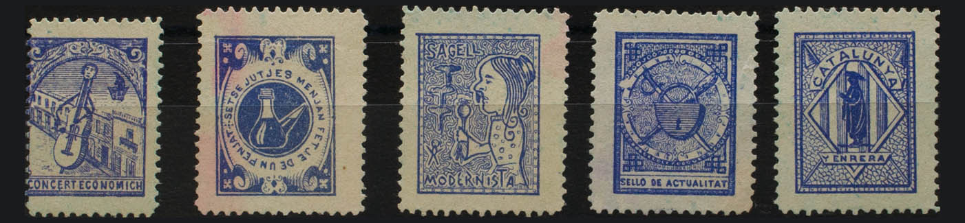 (★)(1900ca). Serie completa, cinco valores, en azul. CATALUÑA. Edición SatÃrico-Cómica. MAGNIFICA. (Nathan 56)
