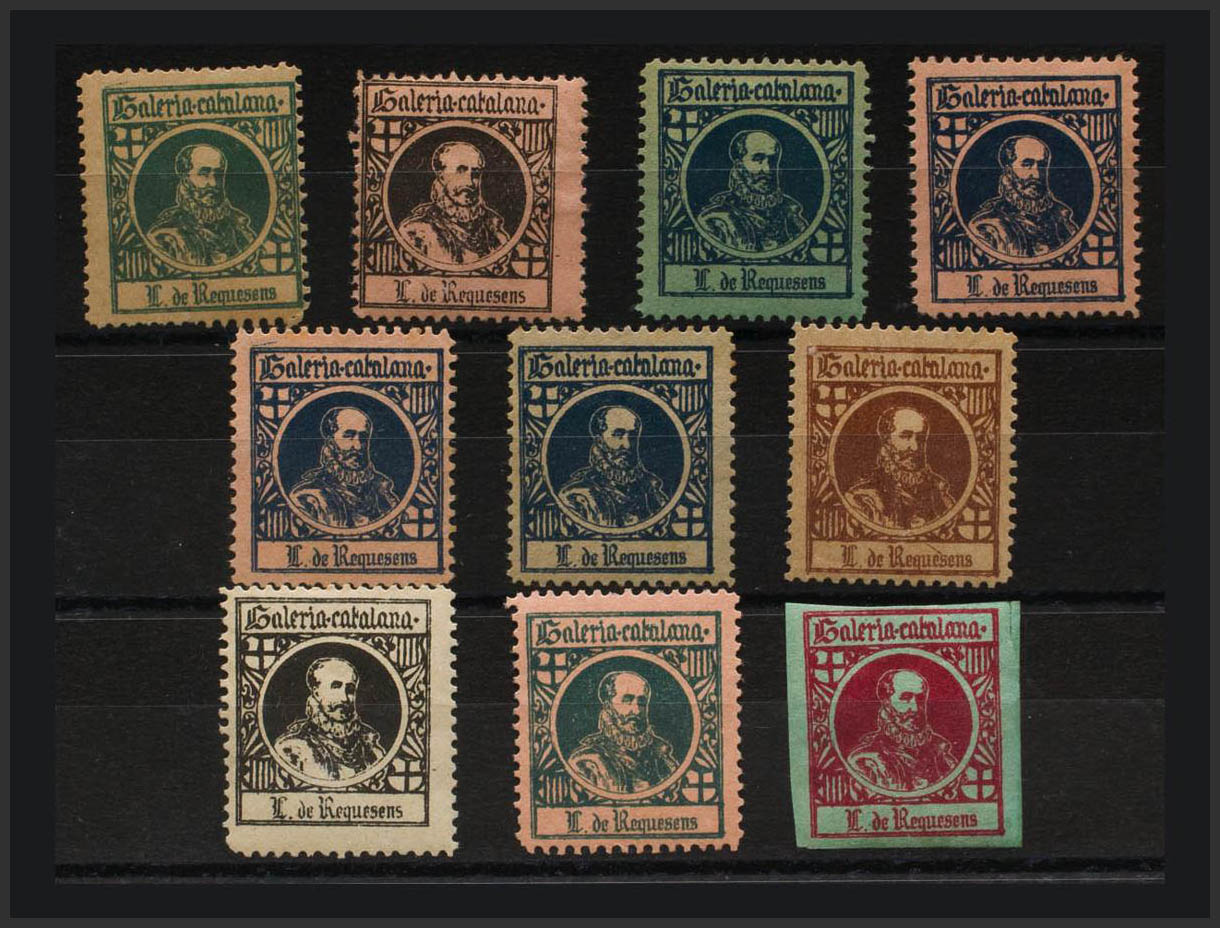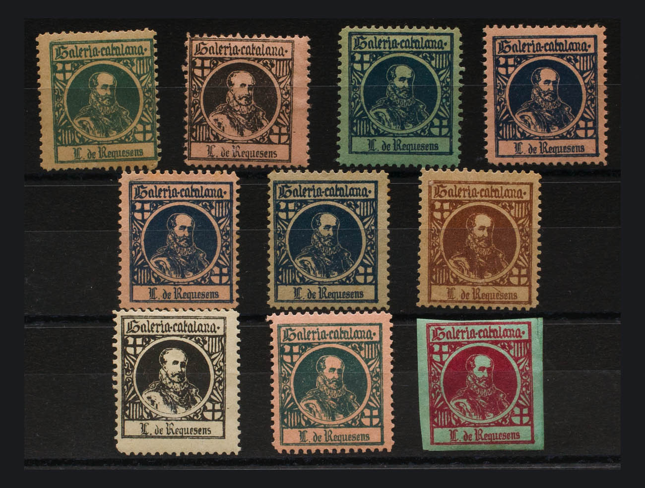 ★/(★)(1900ca). Diez viñetas (una sin dentar), en diferentes colores y papeles. CATALUÑA L. DE REQUESENS. MAGNIFICAS Y RARO CONJUNTO. (Nathan 36-6)