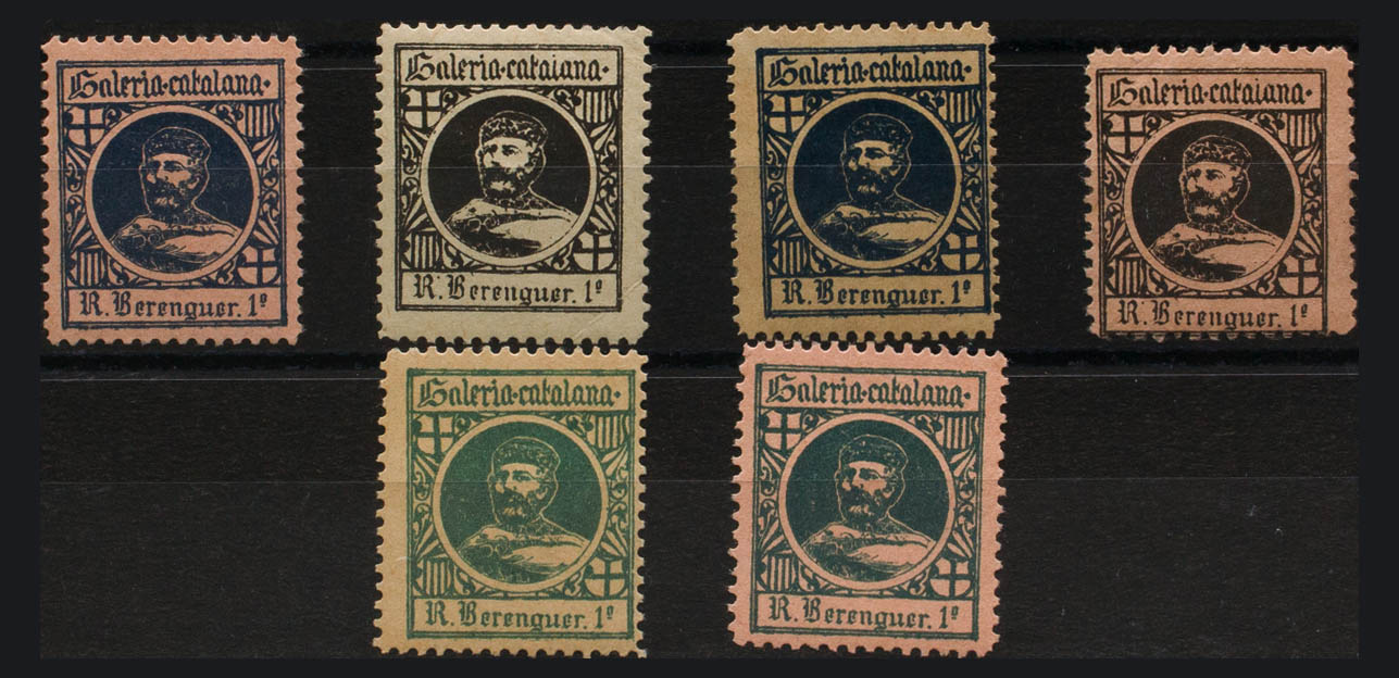 ★(1900ca). Seis viñetas en diferentes colores y papeles. CATALUÑA R. BERENGUER. MAGNIFICAS. (Nathan 36-3)
