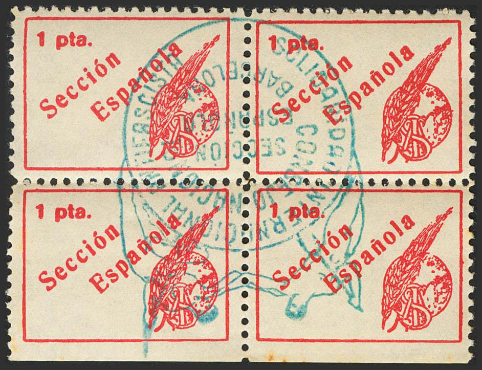 1937. 1 pts rojo, bloque de cuatro. SECCION ESPAÑOLA. MAGNIFICO. (Guillamón 1612, Doménech 122)