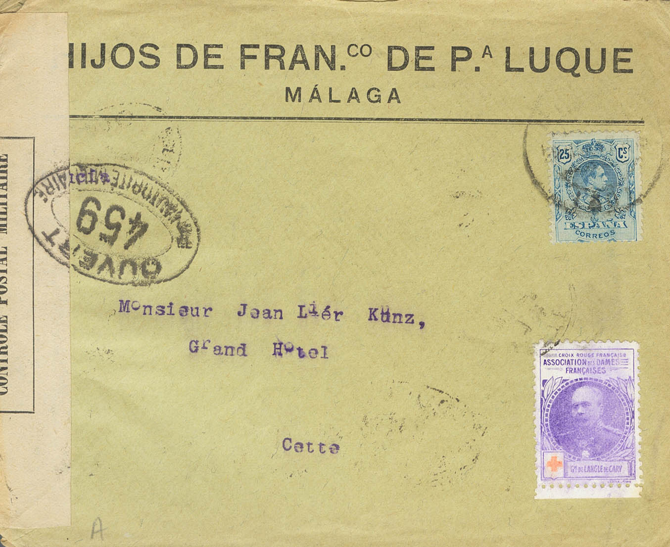 274. 1917. 25 cts azul y viñeta de la Cruz Roja Francesa ASSOCIATION DES DAMES FRANCAISES. MALAGA a CETTE (FRANCIA). Al dorso llegada. MAGNIFICA Y RARA.