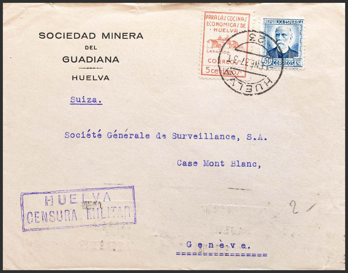 Guerra Civil. Viñeta. HUELVA / 23, al dorso llegada. MAGNIFICA.