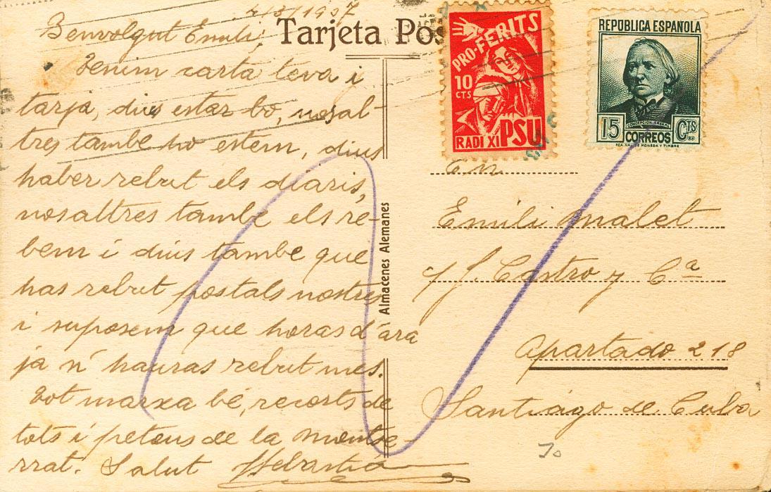 1937. 15 cts verde gris y 10 cts rojo PROFERITS RADI XI PSU. Tarjeta Postal de BARCELONA a SANTIAGO DE CHILE. BONITA Y RARA. (Domenech 693)
