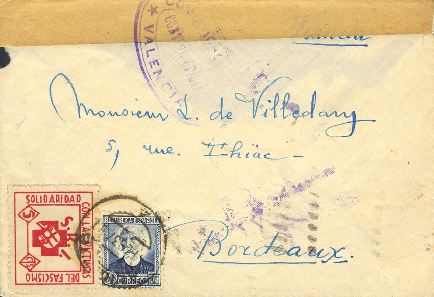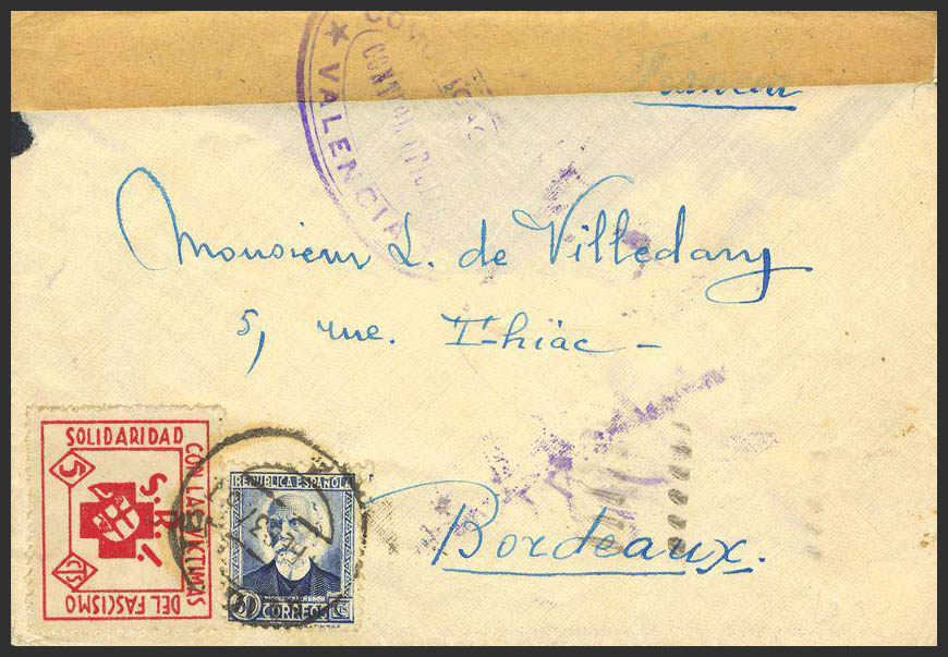688. 1937. 50 cts azul y 5 cts viñeta SRI, solidaridad con las vÃctimas del fascismo. VALENCIA a BURDEOS. Al dorso llegada. MAGNIFICA.