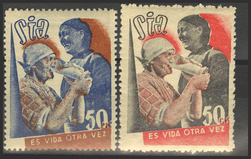 ★1937. 50 cts, dos sellos, uno de ellos ROJO EN LUGAR DE CASTAÑO. S.I.A., ES VIDA OTRA VEZ. MAGNIFICA. (Guillamón 1627/27a).