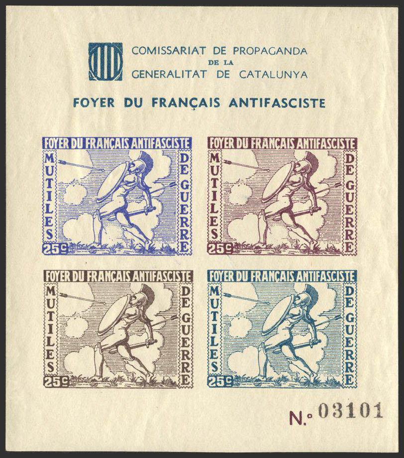 ★1937. Hoja bloque, SIN DENTAR. FOYER DU FRANCAIS ANTIFASCISTE, MUTILES DE GUERRE. MAGNIFICA Y MUY RARA. (Guillamón 2240).