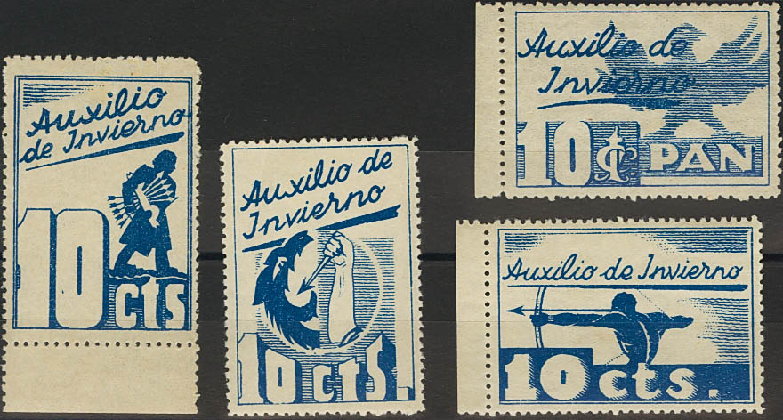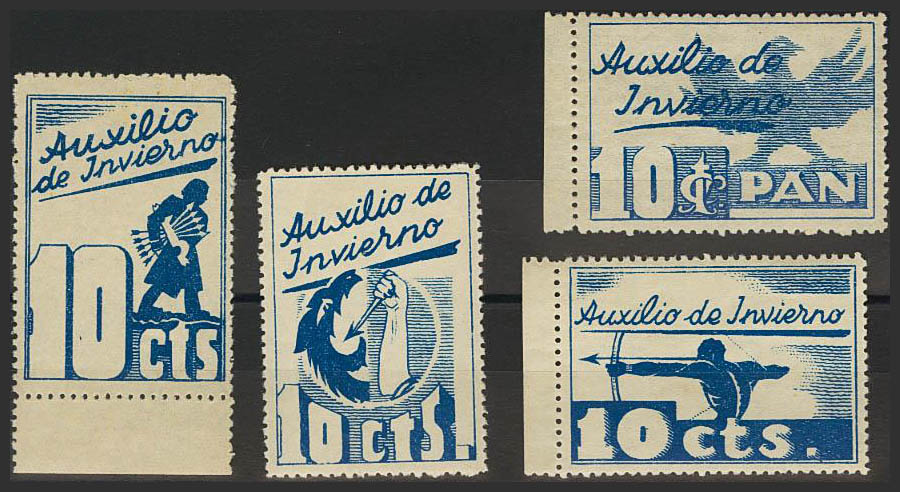 ★(1937ca). Conjunto completo de las cuatro viñetas del 10 cts azul AUXILIO DE INVIERNO. MAGNIFICAS.