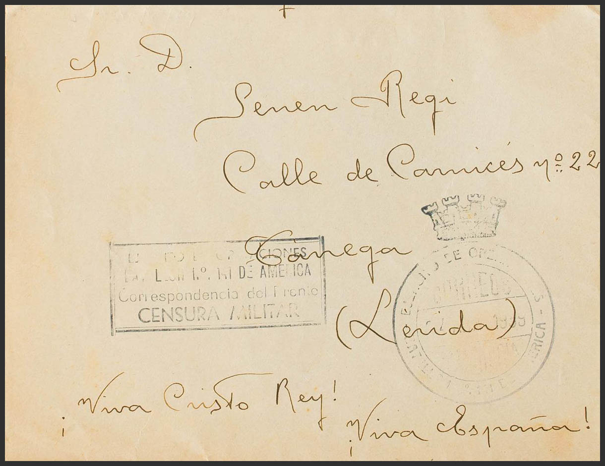 1939. PAMPLONA a TARREGA. Marca de Franquicia EJERCITO DE OPERACIONES / BATALLON Nº141 AMERICA y censura de la misma unidad. MAGNIFICA Y MUY RARA.
