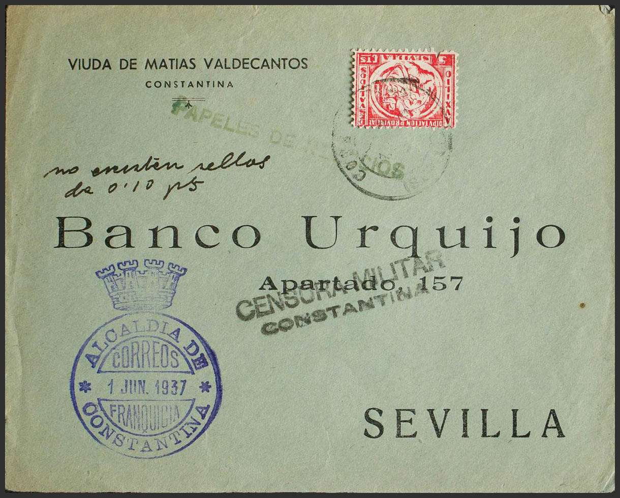 1937. 5 cts rojo Benéfico de AUXILIO DESVALIDOS SEVILLA. CONSTANTINA a SEVILLA. Marca de franquicia ALCALDIA DE / CONSTANTINA y manuscrito "No emiten sellos de 0´10 pts". MAGNIFICA.