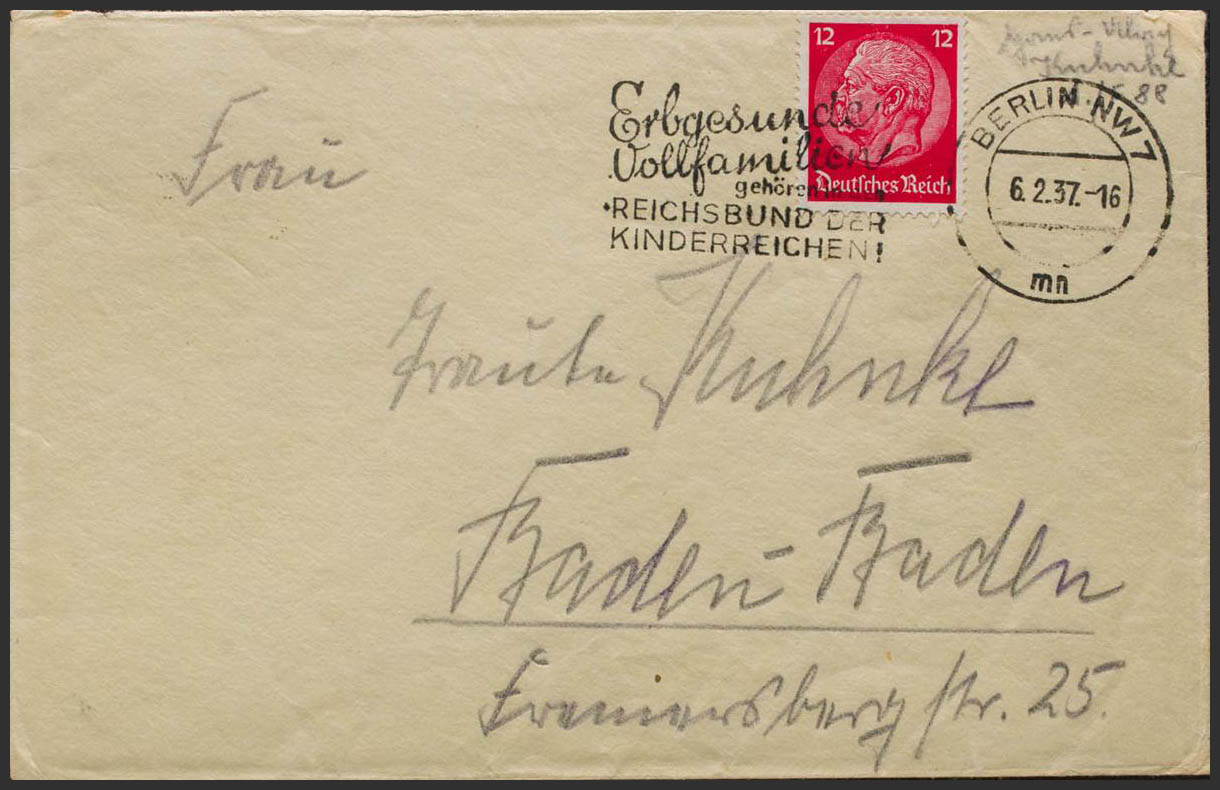 1937. 12 p carmÃn de Alemania. BERLIN a BADEN BADEN, enviada a través de la embajada hasta BerlÃn, donde se franquea con el sello alemán para ocultar el origen de la correspondencia de la Legión Cóndor. MAGNIFICA Y RARISIMA.