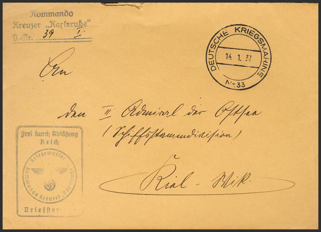 1937. Remitida desde el crucero Karlsruhe y dirigida a KIEL (ALEMANIA). Marca KOMMANDO / KREUZAR "KARLSRUHE" y fechador DEUTSCHE KRIEGSMARINE / Nº33 (este buque participó en la Guerra Civil Española como buque neutral entre 1936 y 1938). MAGNIFICA.