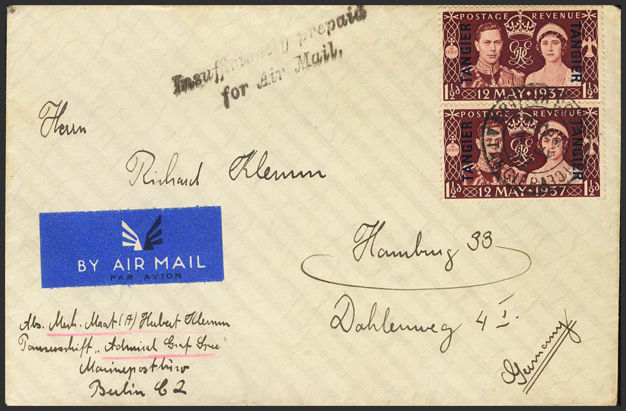 816(2), 817, 823. 1937. 5 cts castaño, dos sellos, 10 cts verde y 30 cts carmÃn rosa. LAS PALMAS DE GRAN CANARIA a CASABLANCA (MARRUECOS). Tasada al dorso con un sello de tasas marroquà de 30 cts. MAGNIFICA Y RARA.