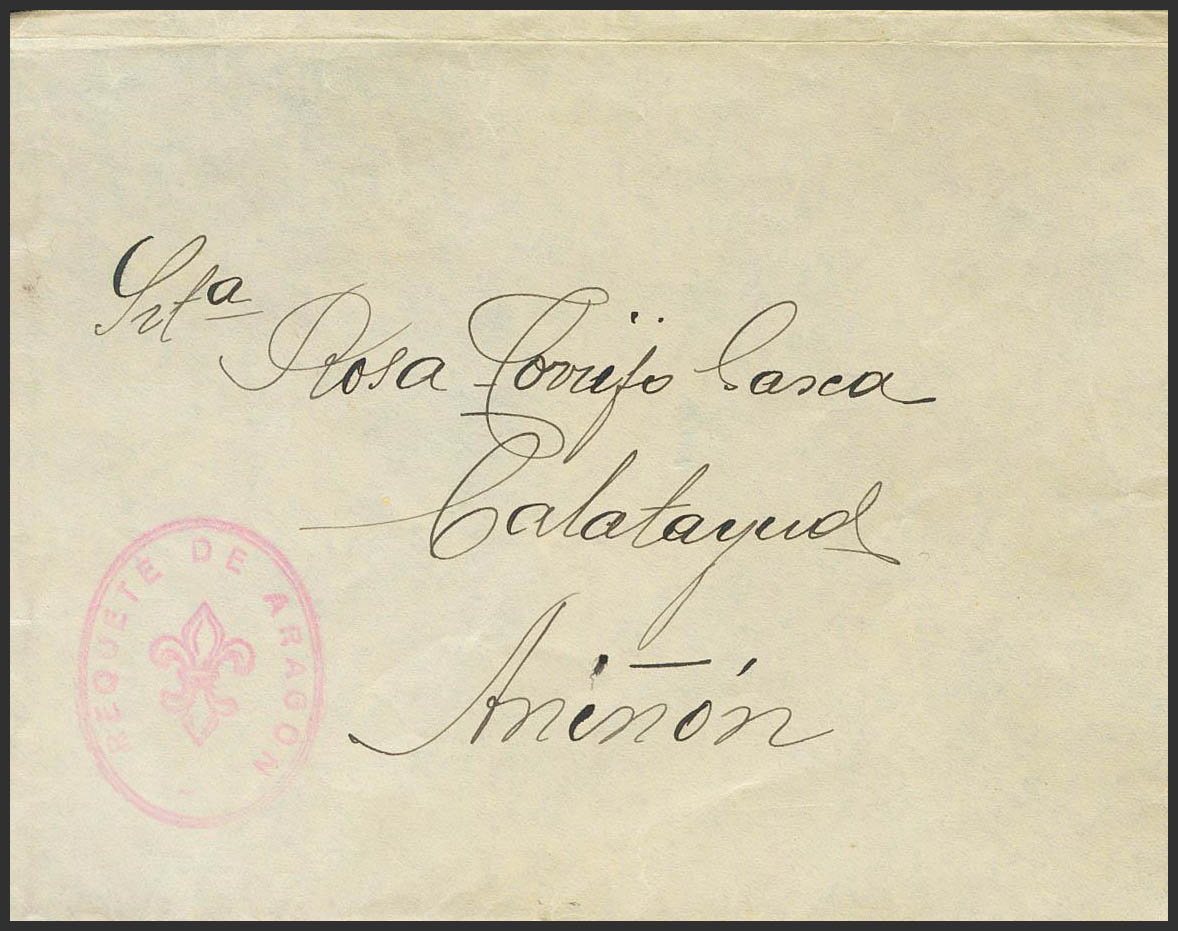 1936. (11 de Agosto). Carta (con texto) de ZARAGOZA a ANIÑON, en el interior membrete LEGION NAVARRO-ARAGONESA REQUETES DE ARAGON PLANA MAYOR. Marca de franquicia REQUETE DE ARAGON, en rojo. MAGNIFICA Y RARISIMA ESPECIALMENTE EN ESTE COLOR.