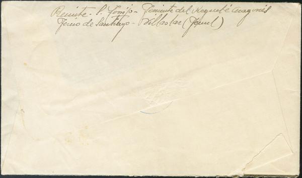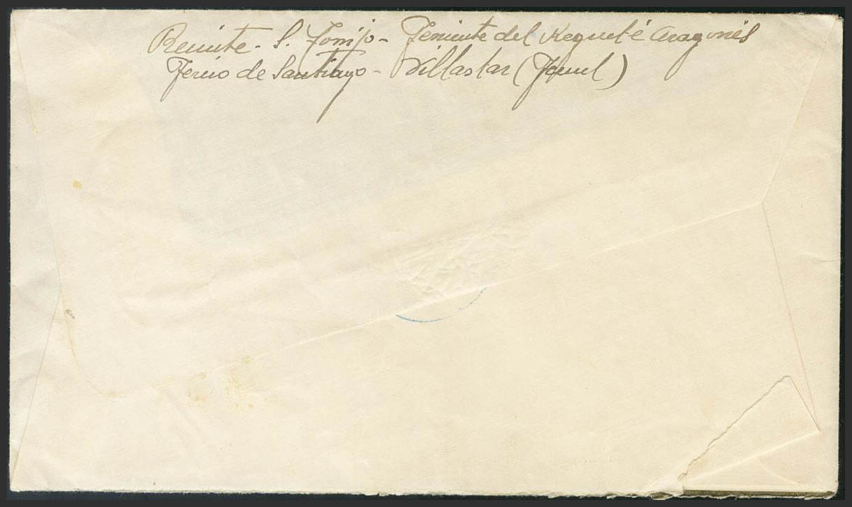 1937. VILLASTAR (TERUEL) (carta con texto) a ANIÑON. Marcas de franquicia COMANDANCIA MILITAR DE / TERUEL y REQUETES DE ARAGON / TERCIO DE SANTIAGO, ambas en azul. MAGNIFICA Y MUY RARA.