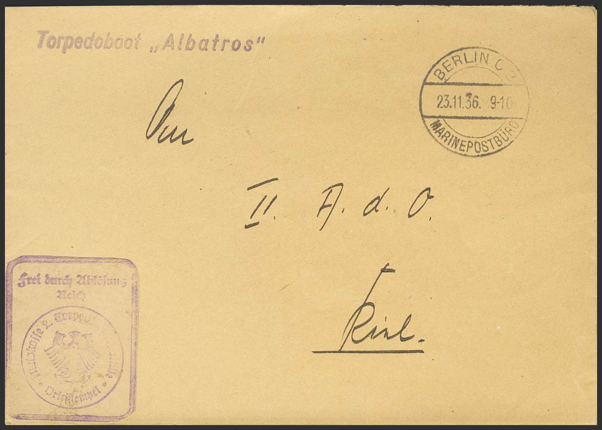1936. Dirigida a KIEL (ALEMANIA). Sobre de un torpedero alemán del KOMMANDO 2 TORPEDOBOOTS FLOTILLE 2, marca en azul y fechador DEUTSCHE KRIEGSMARINE / NR.24, este buque fue uno de los que participó en la protección y control de material bélico de las tropas del bando nacional, en el llamado Comité de No Intervención. MAGNIFICA Y RARA.