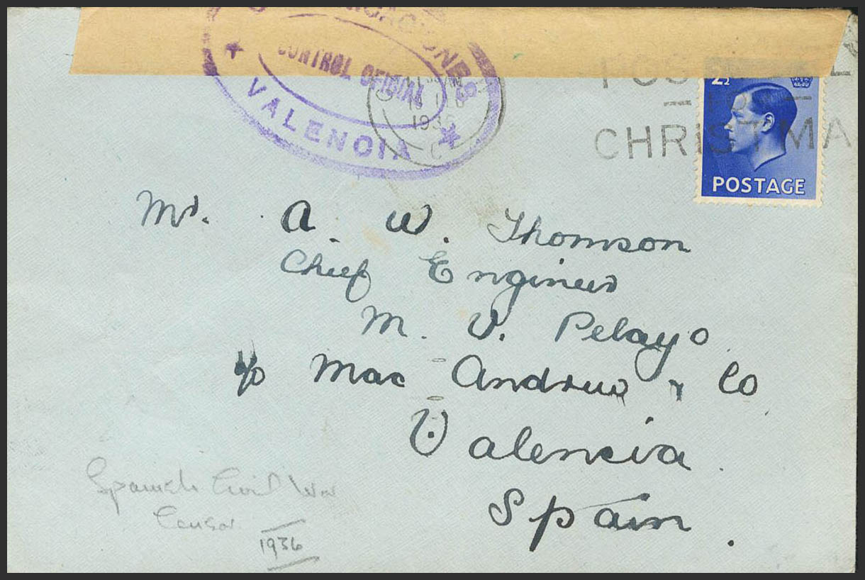 208. 1936. 2½ p ultramar. Dirigida a VALENCIA, al carguero británico M.V. Pelayo, anclado en el puerto de Valencia y que formaba parte del Comité de No Intervención. Marca de censura COMUNICACIONES / CONTROL OFICIAL / VALENCIA, en violeta. MAGNIFICA.